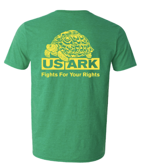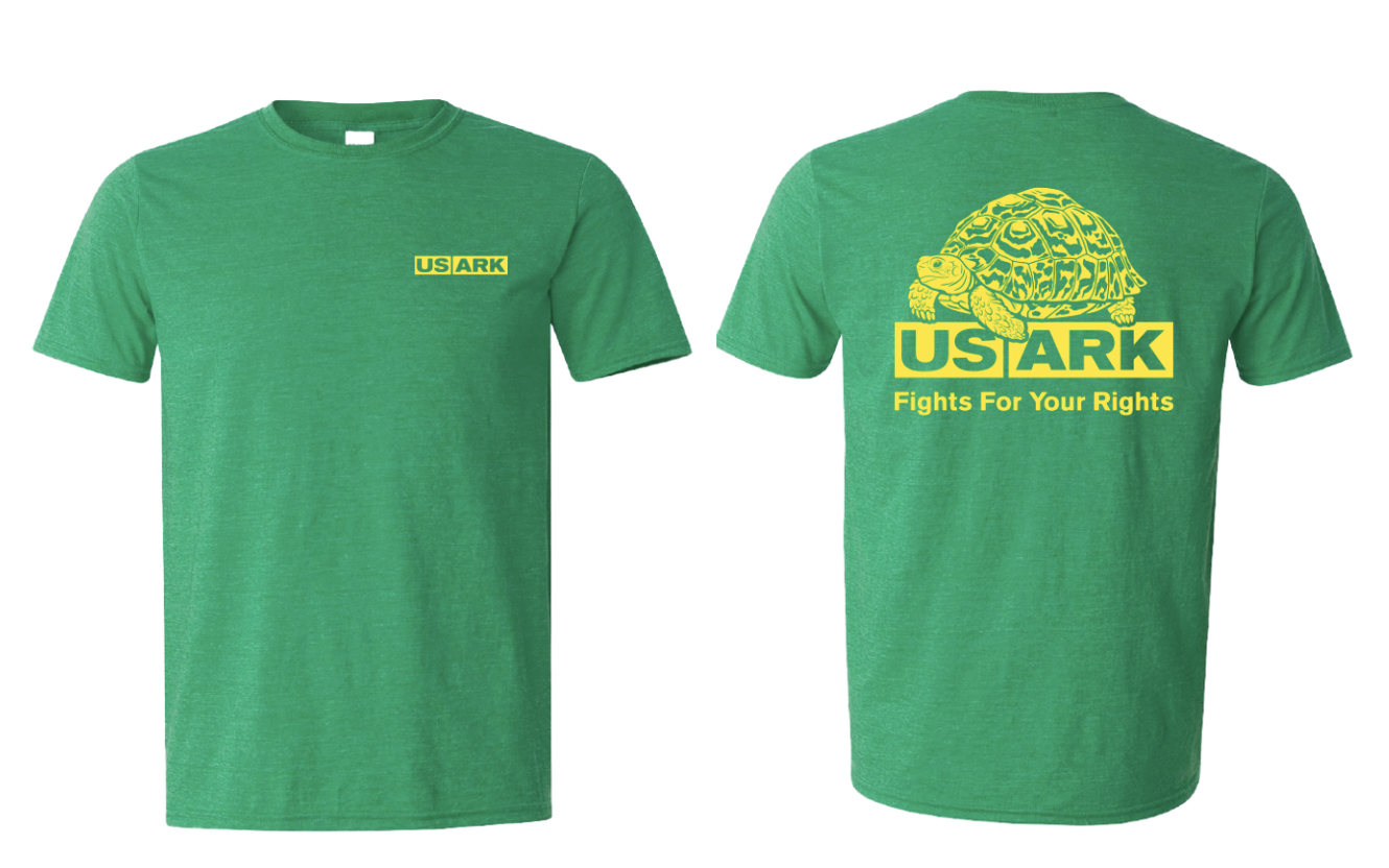 Artist edition shirt! This screen-printed cotton/polyester blend shirt is extremely soft and wrinkle-resistant. It is true to size. Green shirt with yellow ink. U.S. domestic shipping is free! Plus, one USARK sticker per shirt is included (random sticker design). The leopard tortoise image is the back of the shirt. The front has a small USARK logo on the left chest. Adeline Robinson created the artwork at https://www.adelinerobinsonart.com.